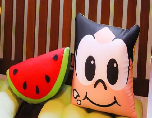 As almofadas personalizadas, especialmente os modelos com recortes especiais, também podem ser usadas na decoração da mesa do bolo, servindo como alternativa para pelúcias e bonecos de feltro.